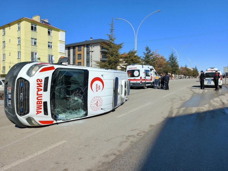 Karaman'da hasta taşıyan ambulans, kavşakta otomobille çarpışınca devrildi.