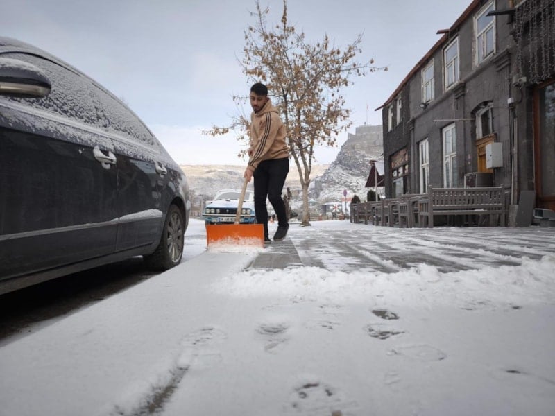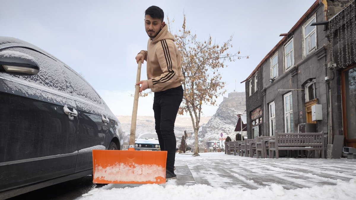 Vatandaşlar, karla kaplanan ev ve iş yerlerinin önleri ile araç camlarını temizledi.