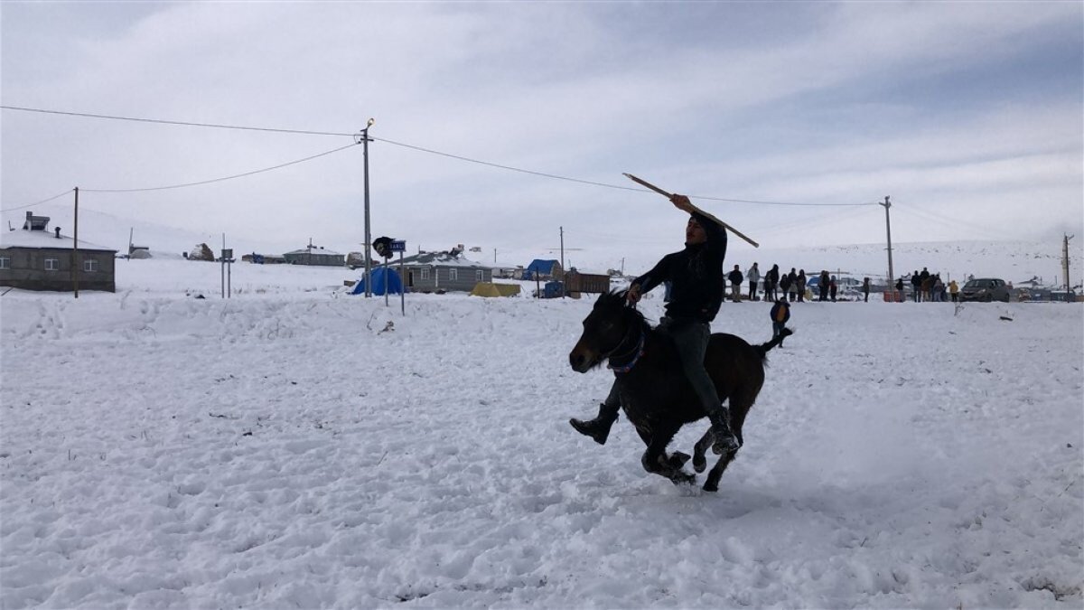 Rakiplerinin attığı ciritlerden kurtulmak isteyen gençler, karlı zemin nedeniyle atların üzerinde durmaya çalışırken sergilediği çevik hareketlerle takdir topladı.