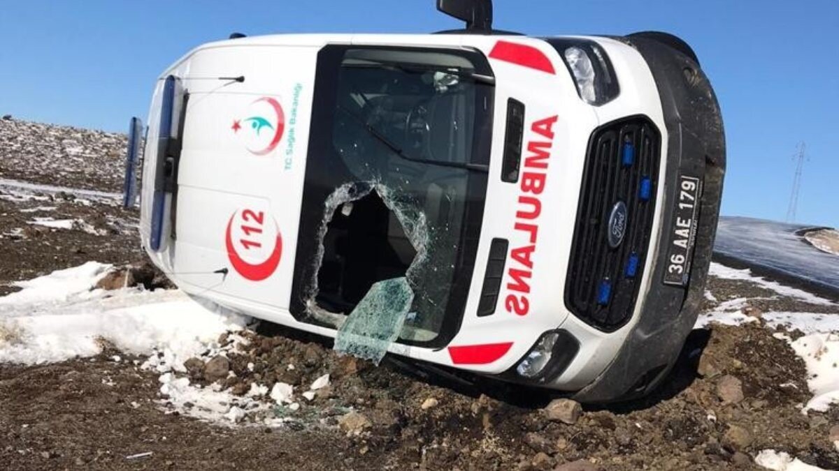 Kars’ın Arpaçay ilçesinden Koçköy’e astım hastasını almak için hareket eden ambulans, Bardaklı köyü mevkisinde yolun buzlu ve kaygan olmasından dolayı sürücüsünün direksiyon hakimiyetini kaybetmesiyle takla atarak devrildi.