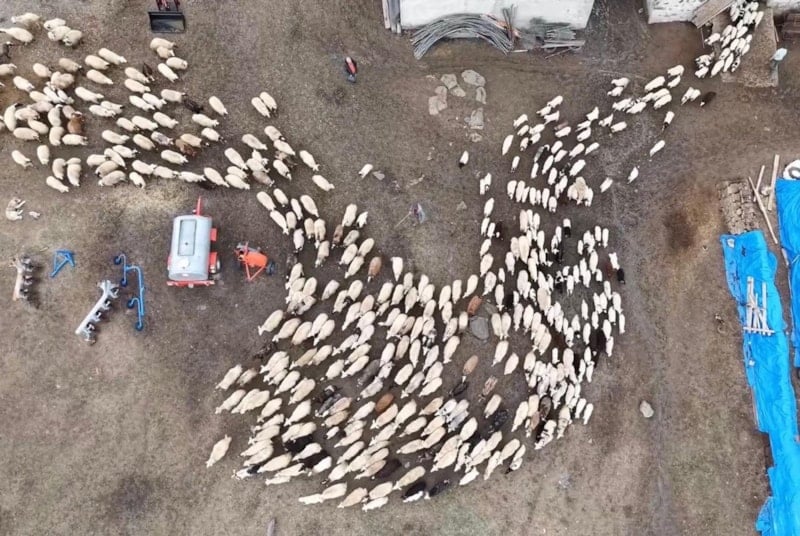 Drone kamerasıyla kayda alınan görüntülerde, sürünün çiftlik alanına girişinden kuzuların annelerini bulduğu ana kadar yaşanan hareketlilik dikkat çekti.