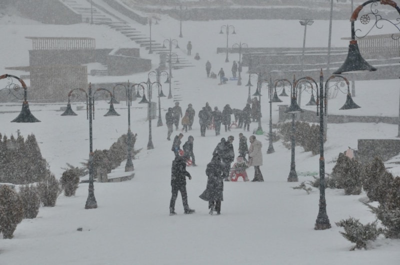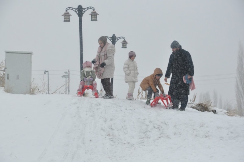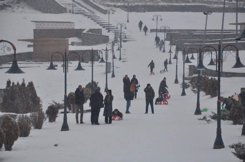 Yanlarında getirdikleri kızaklar, naylon poşetler ve tepsilerle kayanların neşesi, kentin sessizliğini kahkahalar bozarken dondurucu soğuk, eğlenceye engel olamadı.
