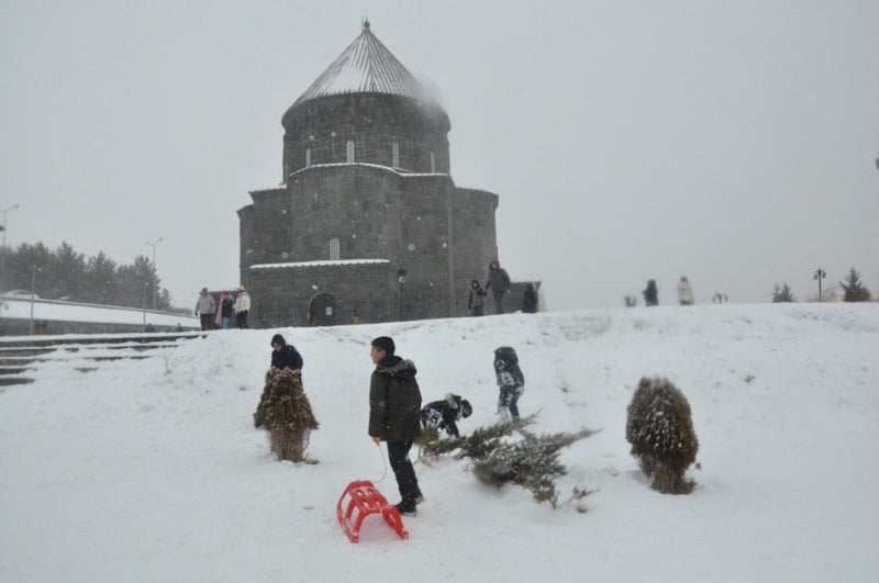Hava sıcaklığının sıfırın altında 13 dereceye düştüğü kentte başlayan kar yağışı, Kars Kalesi, Ebu'l Hasan Harakani Türbesi ve Tarihi Taş Köprü gibi simge mekanlarda kartpostallık görüntüler oluşturdu.