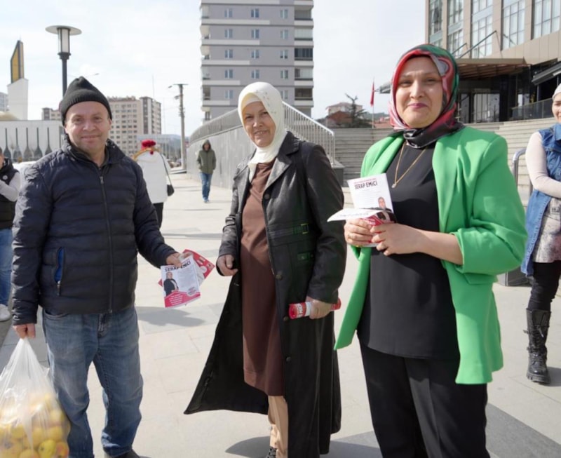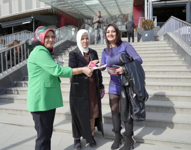 Sokak sokak gezerek projelerini anlatan anne ve kızı, bastırdıkları broşürleri vatandaşlara dağıtarak oy istiyor.