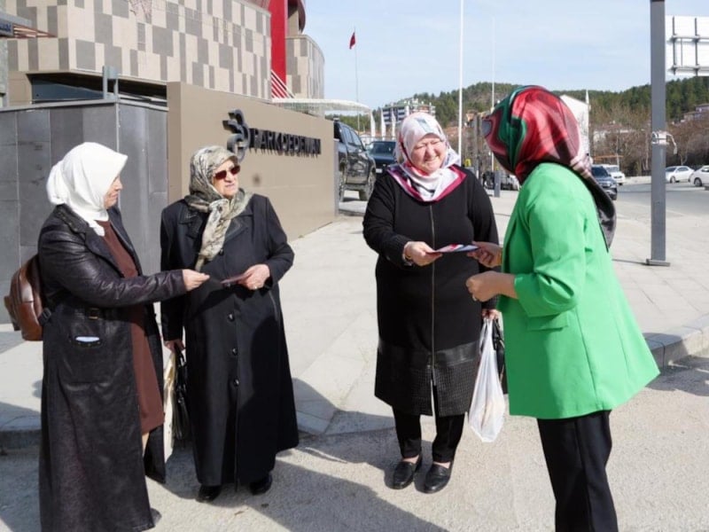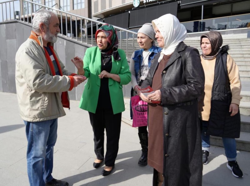 Cadde ve sokaklarda bir yandan örgüsünü ören Kadriye Mıcık, diğer yandan da azalarıyla birlikte broşür dağıtarak vatandaşlardan oy istiyor.
