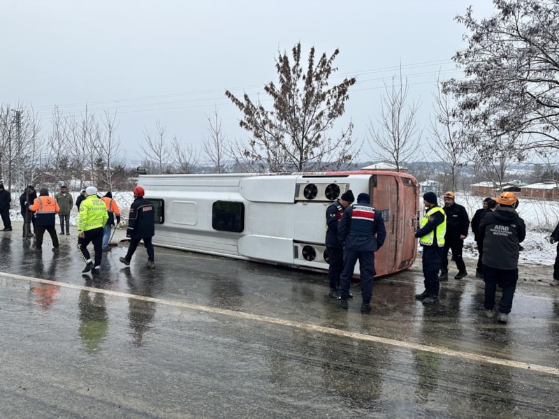 Kar yağışı sebebiyle yoldan çıkarak bariyerlere çarpan midibüs, yan yattı. Kazada 13 kişi yaralandı.