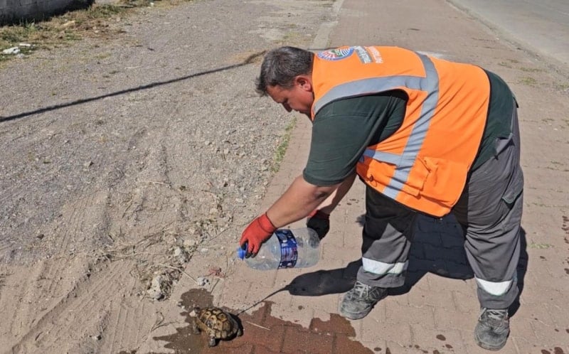 Ardından Ömer Salman ve Mustafa Acar, sıcaktan bunalan, bitkin ve halsiz düşen kaplumbağaları su dökerek serinletti.