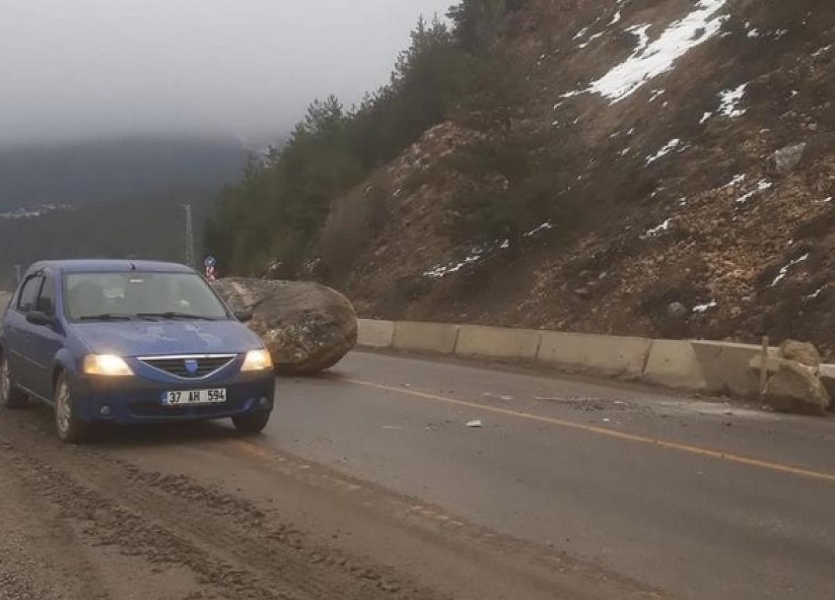 Kastamonu-İnebolu Karayolu'nun Ödemiş mevkiinde, dağdan kopan büyük bir kaya yola düştü. Kayayı yolda gören sürücüler, hemen durumu Karayolları ekiplerine bildirdi.