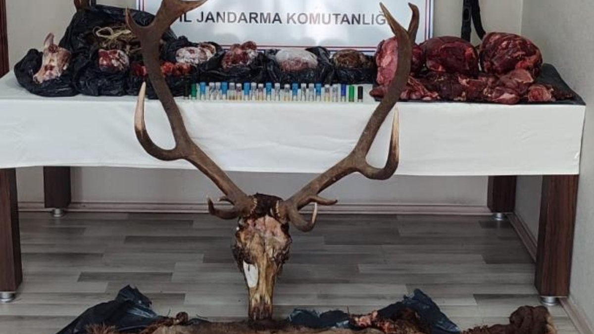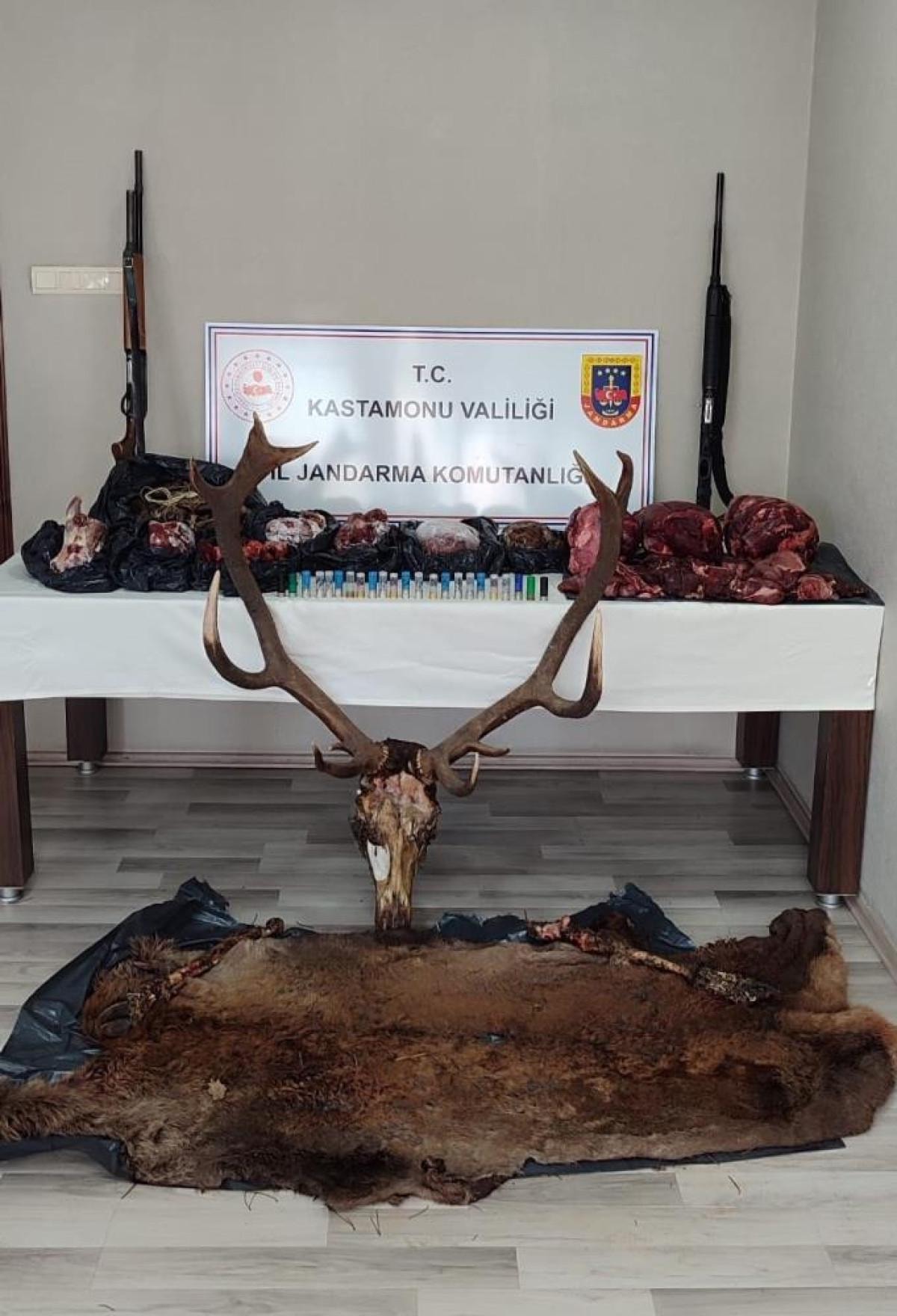 3 farklı adreste yapılan aramalarda bir geyiğe ait kafa, dişler, post ve boynuz, 36 bin 100 gram geyik eti, 14 bin 400 gram geyik etinden yapılmış sucuk, 5 bin 930 gram tavşan eti, 2 adet av tüfeği ile 32 adet av tüfeği fişeği ele geçirdi.