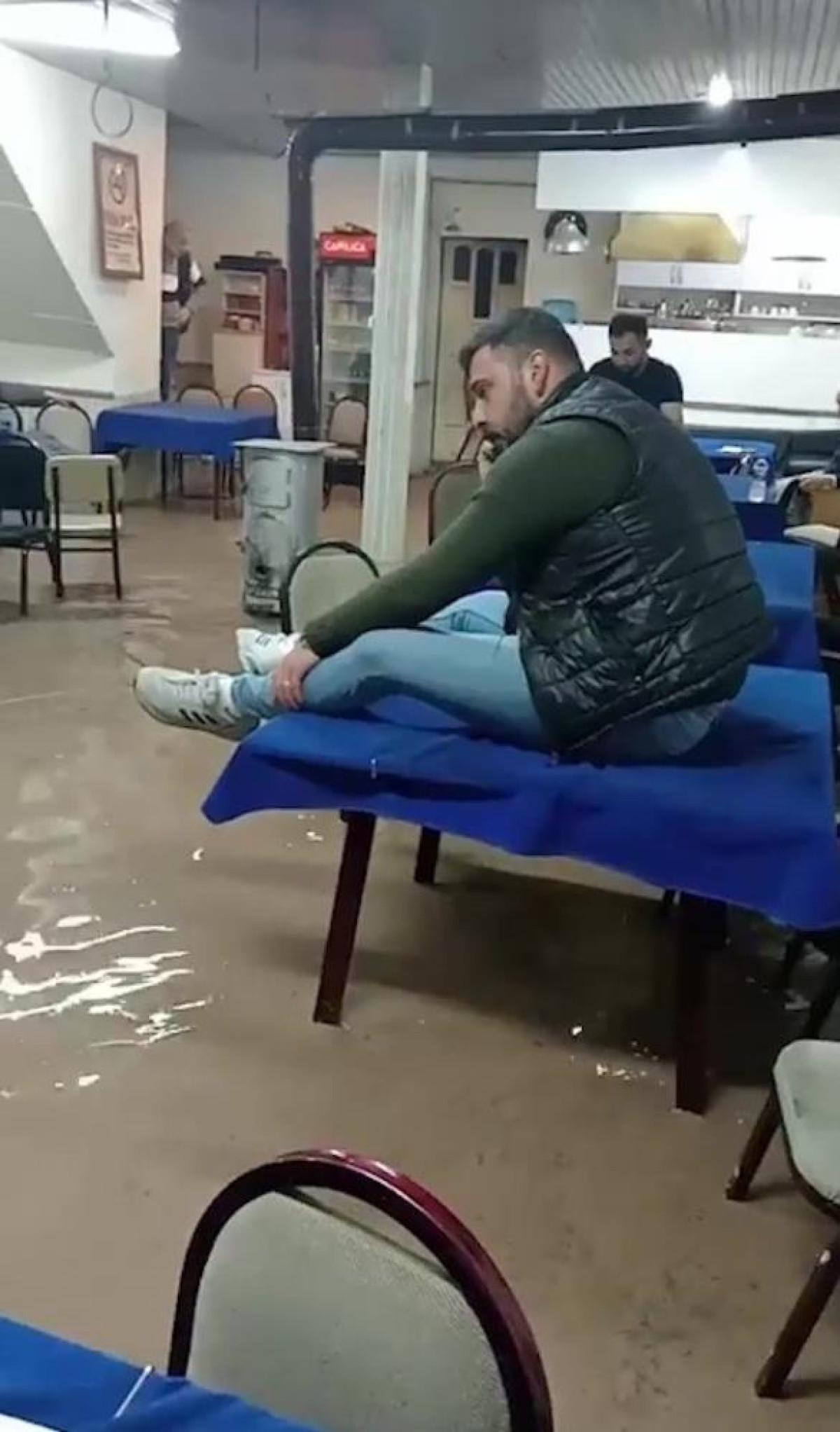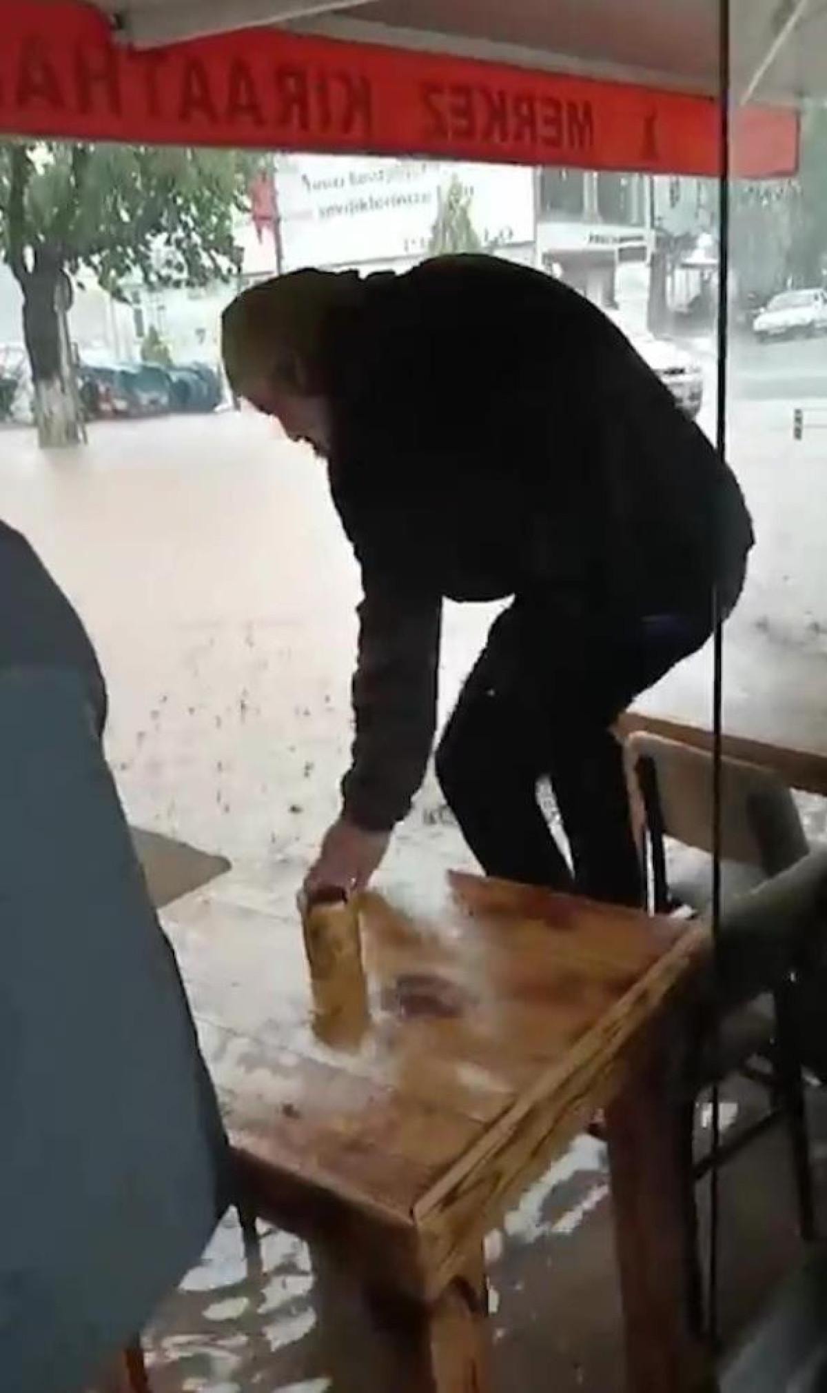 Vatandaşlar ıslanmamak için masa ve sandalyelerin üzerine çıktı.