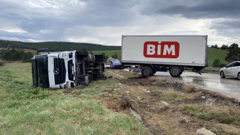 Kastamonu-Daday karayolunda seyir halindeki 34 BDZ 455 plakalı, BİM firmasına ait Mercedes marka kamyon, sürücüsünün direksiyon hakimiyetini kaybetmesi sonucu kontrolden çıkarak devrildi.