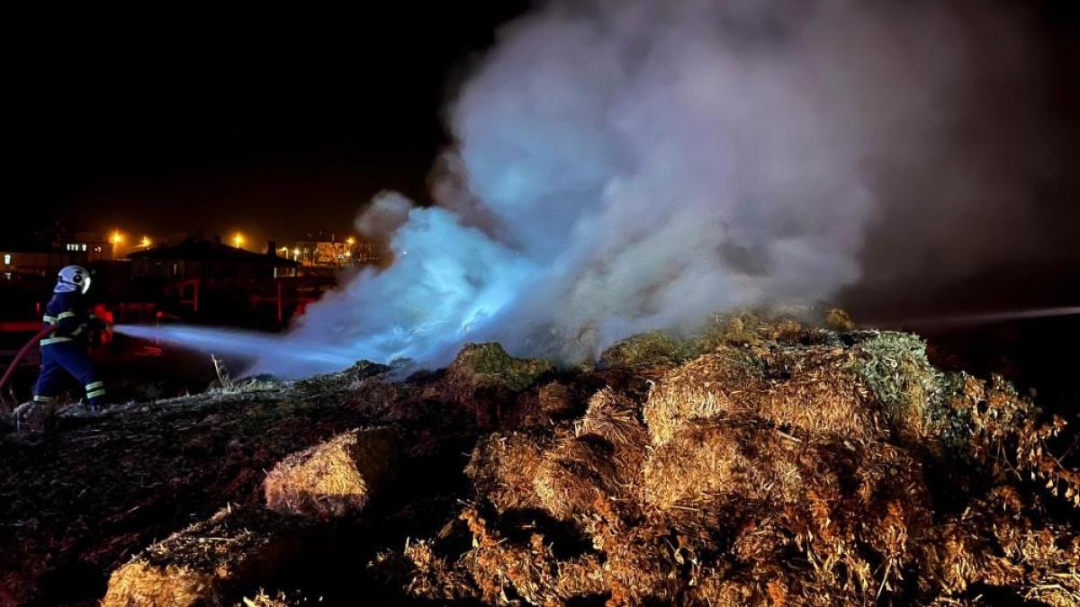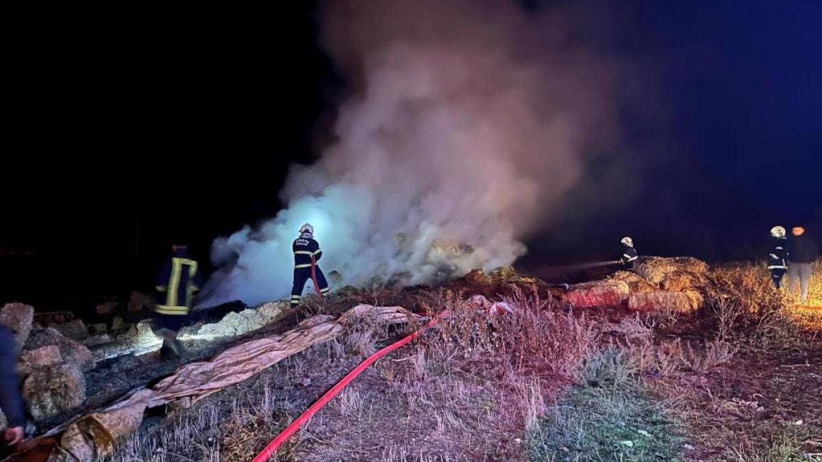 Saman balyalarının bulunduğu alanda çıkan yangını fark eden köylüler, durumu 112 Acil Çağrı Merkezi’ne bildirdi.