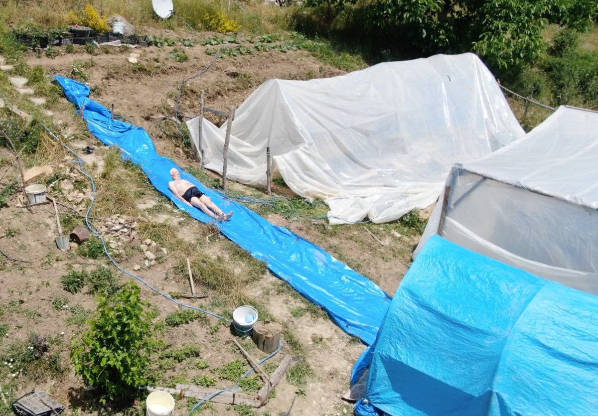 Kendi aquaparkını yapan Saraç, gün içinde bahçede çalıştıktan sonra su kaydırağında kayarak ve havuza girerek serinliyor.