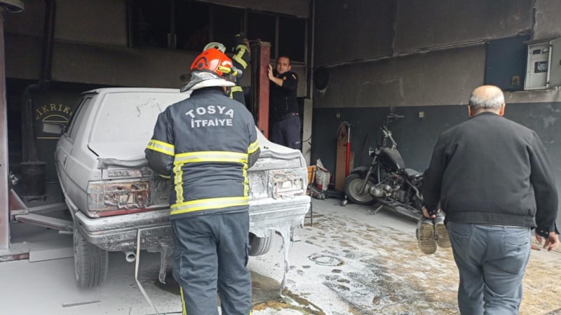 Tosya ilçesinde bir oto tamirhanesinde park halinde olan ve ustanın üzerinde çalıştığı otomobil aniden alev aldı. Yangında usta ile yanında çalışan çırağı yaralandı. O anlar güvenlik kamerasına yansıdı.