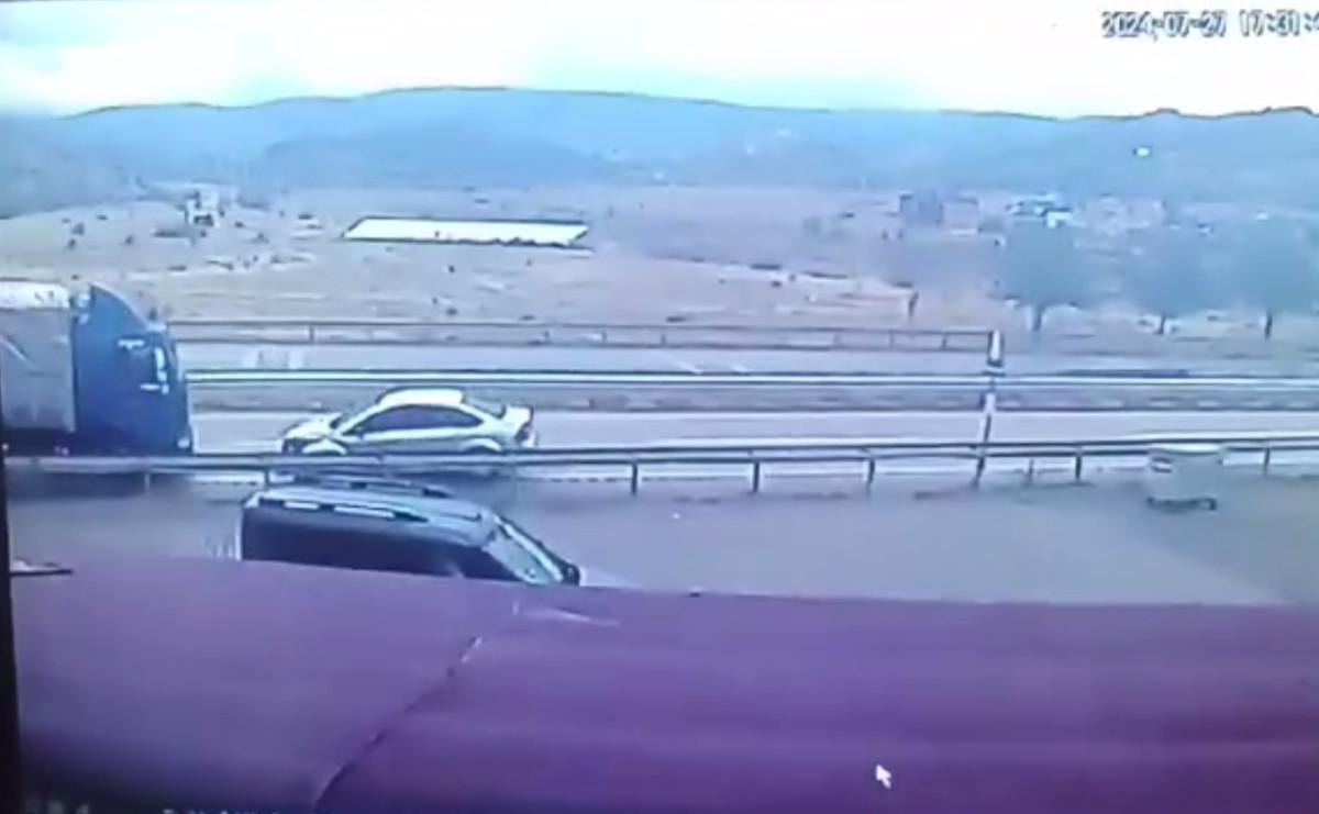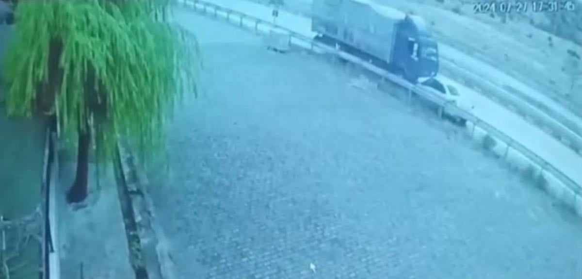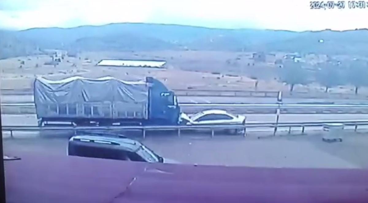 Kamyon ile otomobilin karıştığı kaza anı bölgede bulunan güvenlik kameralarına yansıdı. Görüntülerde, aynı yöne giden otomobilin sürücüsünün direksiyon hakimiyetini kaybetmesiyle karayolunda ters istikamette döndüğü ve bu sırada arkasından gelen kamyonun çarptığı görüldü.
