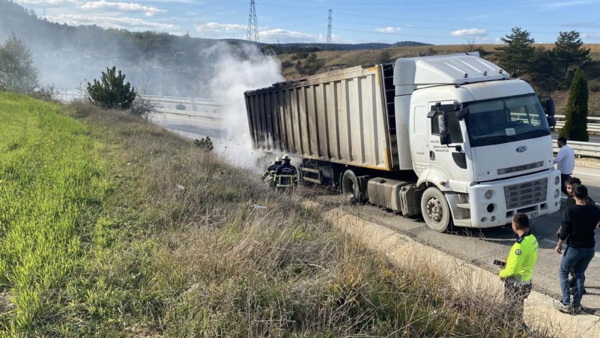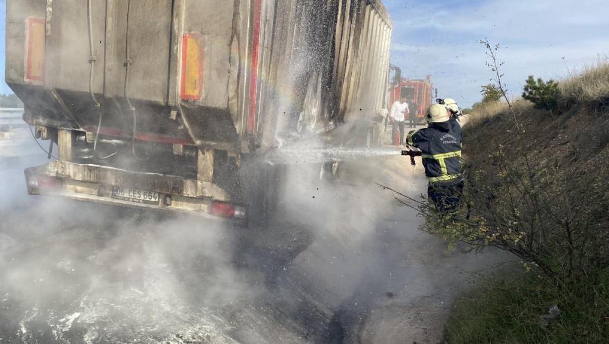 Kısa sürede büyüyen yangını fark eden sürücü, tırı durdurarak 112 Acil Çağrı Merkezi'nden yardım istedi.