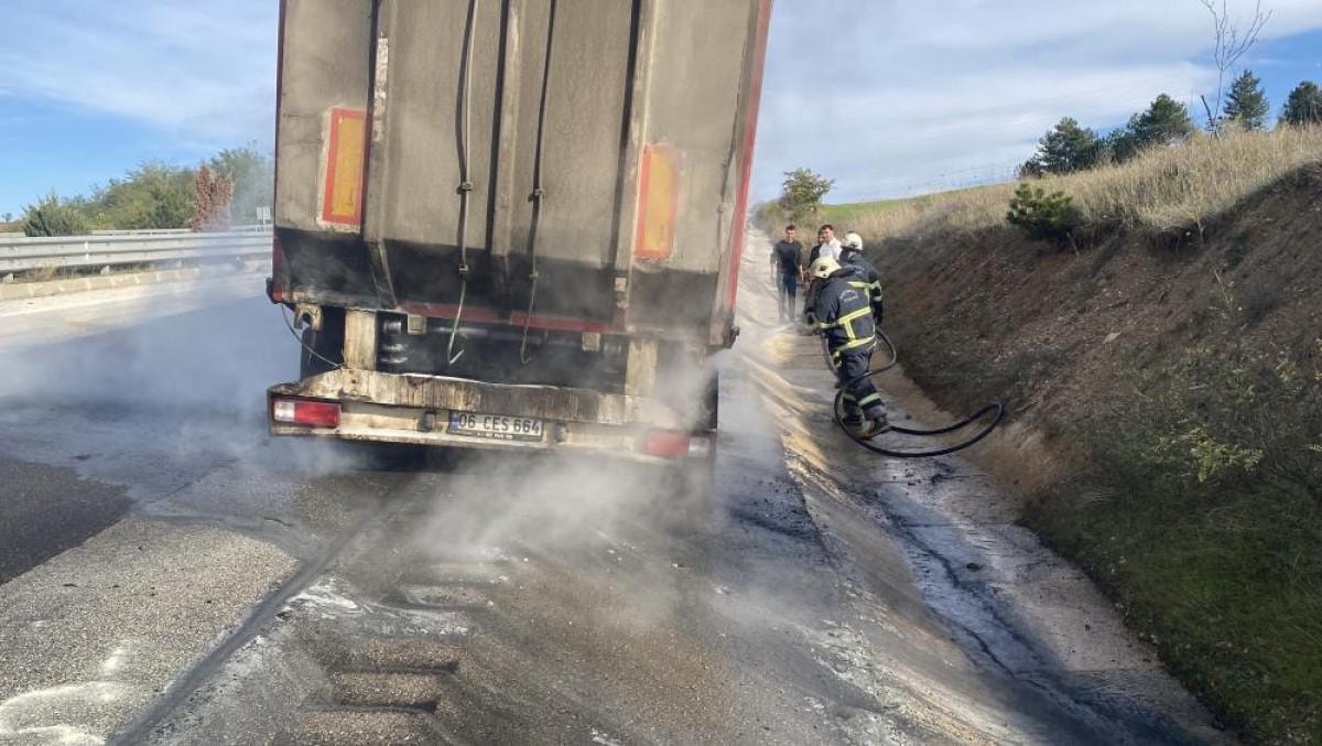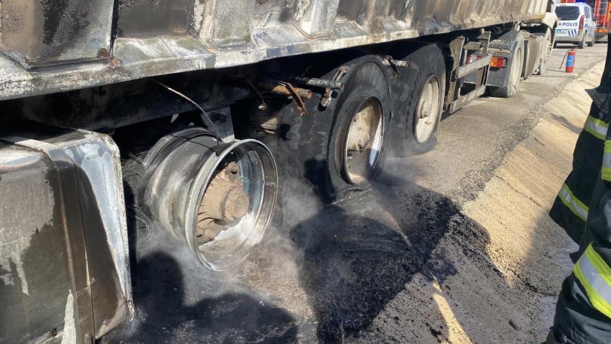 M.Ş. idaresindeki çöp yüklü tırın dorsesinin teker kısmında, bilinmeyen bir sebeple yangın çıktı.