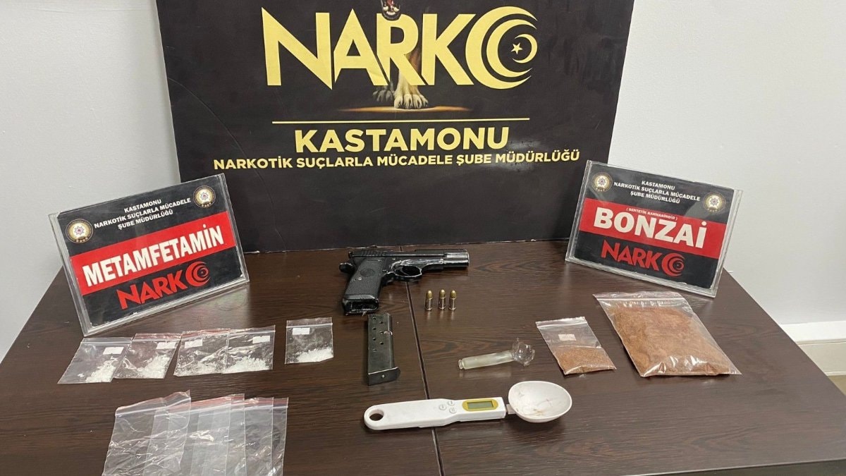 Bu çerçevede tespiti edilen N.K.’nin üst ve aracında arama yapıldı. Yapılan aramada 53,67 gram cannabinoids maddesi, 3,75 gram Metamfetamin maddesi, 1 adet ruhsatsız tabanca, 3 adet tabanca fişeği, 1 adet hassas terazi ve 29 adet uyuşturucu madde paketlemede kullanılan şeffaf poşet ele geçirildi.