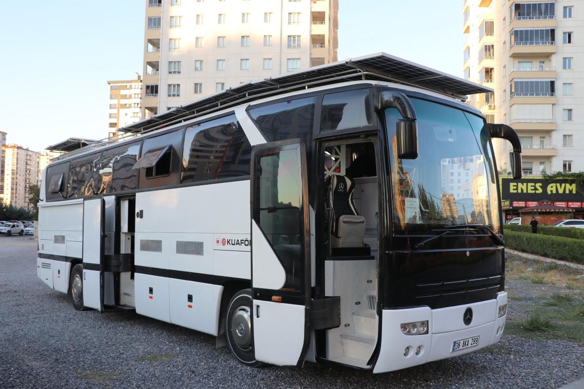 Enerji ihtiyacımızı 8 adet 550 W panel ile sağlıyoruz.200 amper jel akümüz var. Normal bir bağ evinin 2 katı şeklinde bir sistem yaptık. Buzdolabı, çamaşır makinesi ve ev tipi klimayı rahatlıkla çalıştırabiliyoruz. 4 ayda bu karavanı bitirdik. 2 milyon TL’ye bu karavanı dizayn ettik. ‘Kuaförbüs’ karavanımızı ilk önce Türk devletlerini, Özbekistan, Türkmenistan gibi Türk dünyası ülkelerini gezip, sonrasında da bazı ülkeleri ziyaret etmeyi istiyorum. Amacımız, daha çok yer gezip, daha çok insanlarla iletişim kurmak. Burada bizim asıl amacımız ise, benim hayalim ile ticareti bir araya getirmek. Yeni insanlar ve yeni yerler keşfedebilmek.” ifadelerini kullandı.