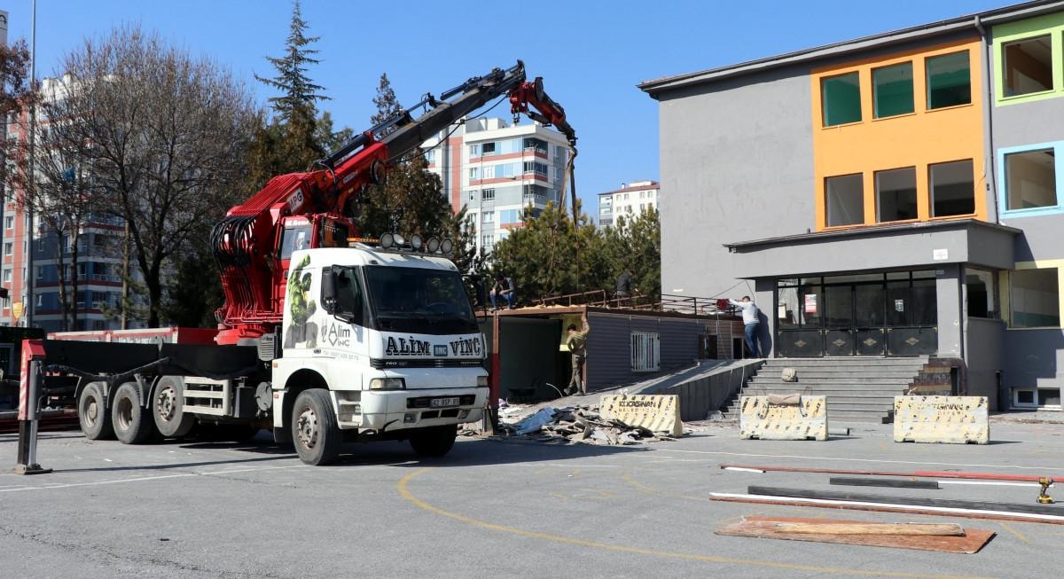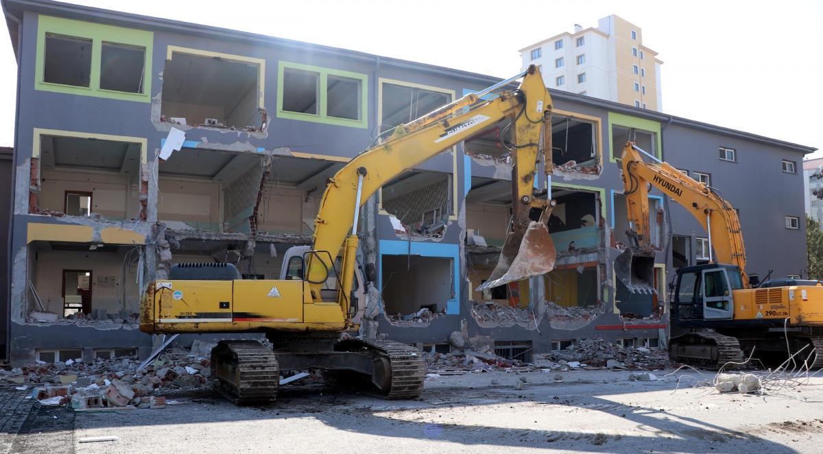 Çevresine güvenlik şeridi çekilen okulun, iş makineleri ile kontrollü yıkımına başlandı.