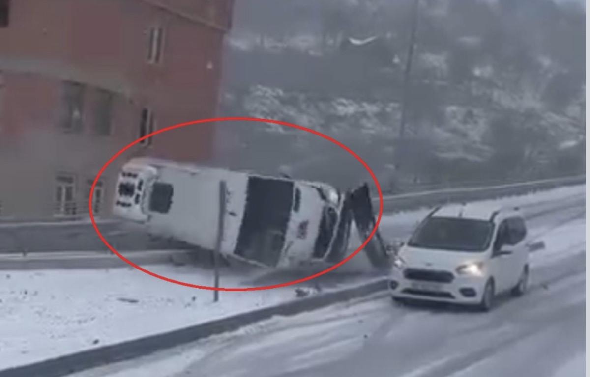 Görüntülerde, servis minibüsünün kayganlaşan yolda bir süre ilerlediği ardından da yönlendirme levhalarına çarparak devrildiği görüldü.