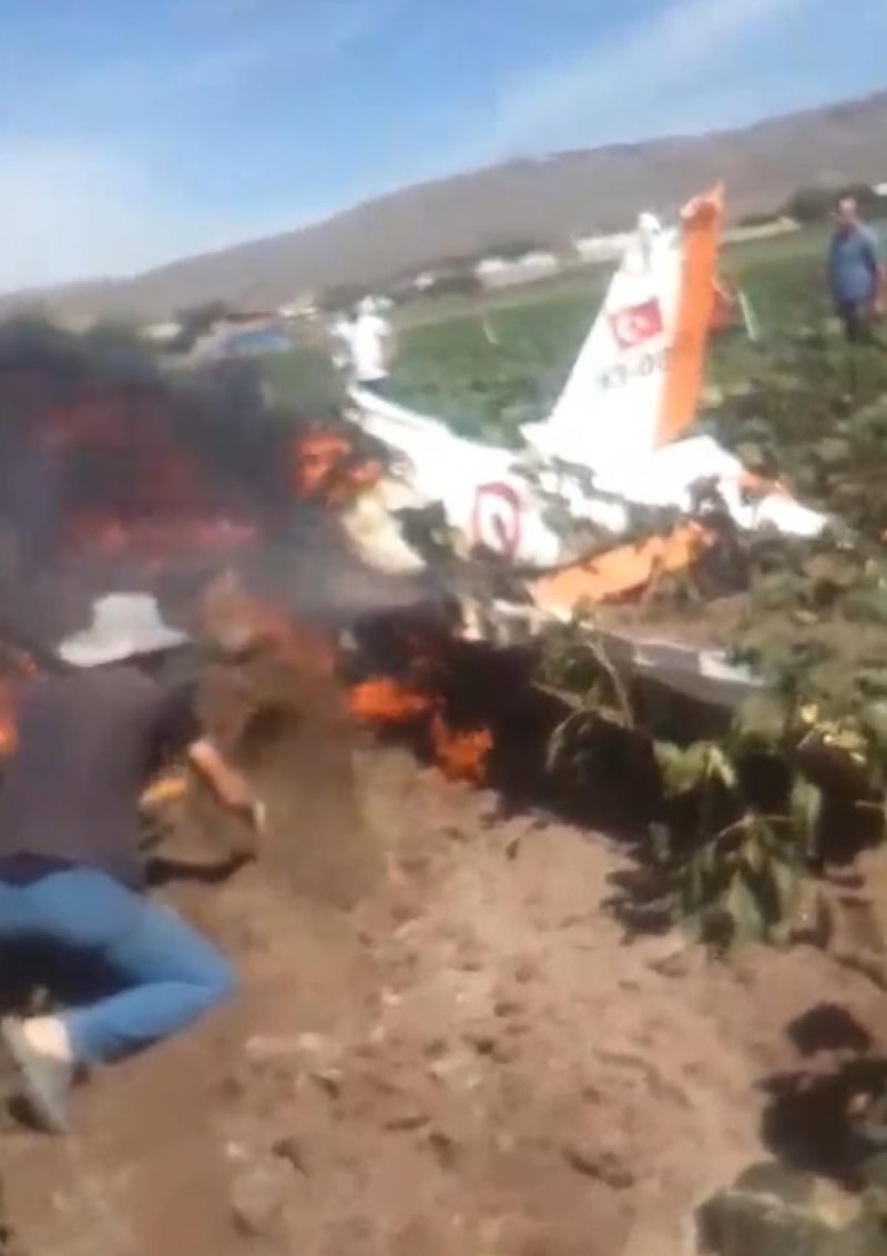 Görüntülerde, bölgede bulunanlar ile tarım işçilerinin uçaktaki alevlere su döktükleri, bazılarının ay çekirdeklerini sökerek alevlerin üzerine attığı, bazıların da elleri ile tarladaki toprakları alevlere atarak söndürmeye çalıştıkları görüldü.