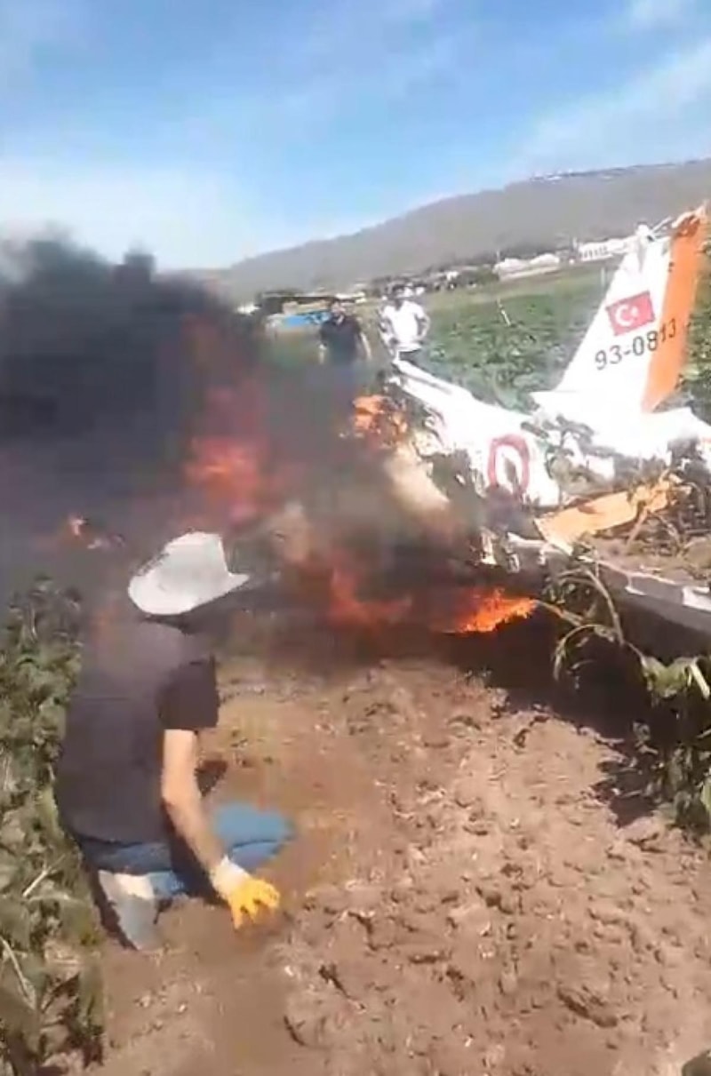 2 pilotun şehit olduğu eğitim uçağı kazasına müdahale eden görgü tanıklarından tarım işçisi Kasım Tutan, uçağın nasıl düştüğünü anlatırken kaza sonrasında cenazelerin yanmaması için 5 bidon su ile alevlere müdahale ettiklerini söyledi.