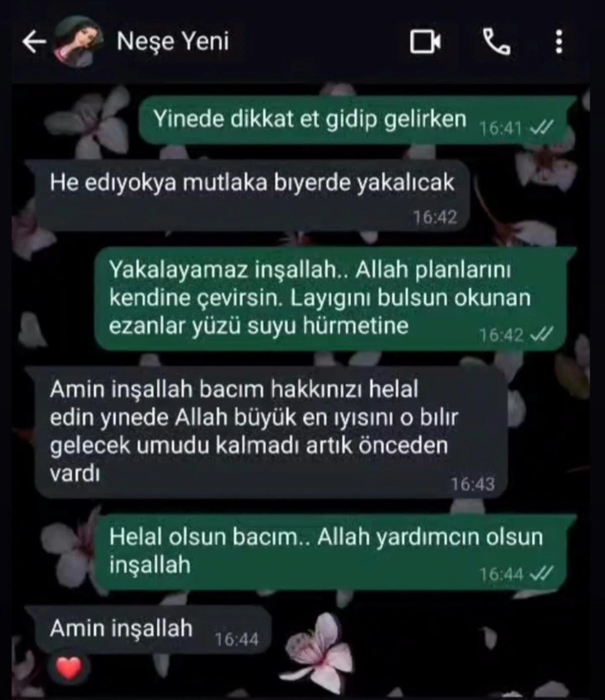Karakaya'nın arkadaşına, eşinin kendisini bir yerlerde yakalayacağını söylediği görüldü. Arkadaşının, Neşe Karakaya'ya, 'Yakalayamaz inşallah. Allah, planlarını kendine çevirsin. Layığını bulsun, okunan ezanlar yüzü suyu hürmetine' dediği, Neşe Karakaya'nın da 'Amin inşallah bacım. Hakkınızı helal edin yine de. Allah büyük. En iyisini o bilir. Gelecek umudu kalmadı artık önceden vardı." yazdığı ortaya çıktı.