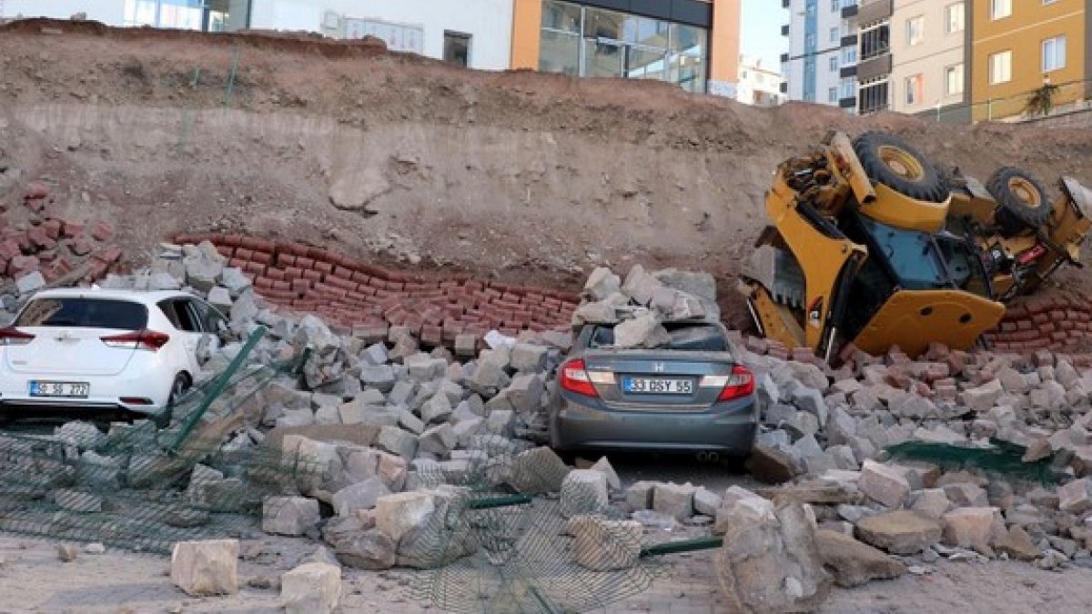 İş makinesi kayan toprakla birlikte sitenin bahçesine yuvarlandı. Çöken istinat duvarı, park halindeki 38 US 267, 33 DSY 55, 50 SG 272 ve 34 CBN 437 plakalı otomobillerde hasara neden oldu.