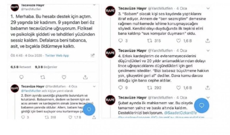 Twitter'da 'Tecavüze hayır' başlığıyla hesap açan D.A., yaşadıklarını anlatarak, "9 yaşından beri öz babamın tecavüzüne uğruyorum. Fiziksel ve psikolojik şiddeti ve tehditleri yüzünden sessiz kaldım. Defalarca beni tabanca, asit ve bıçakla öldürmeye kalktı. Babaannem, dedem ve benim için en acısı; annem ve kardeşlerim olmak üzere tecavüzcü babamın yanında oldular." ifadelerini kullandı.