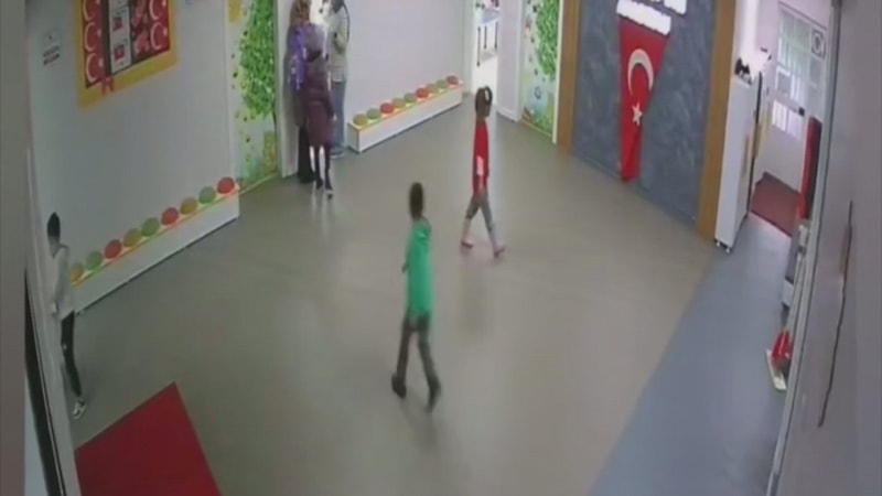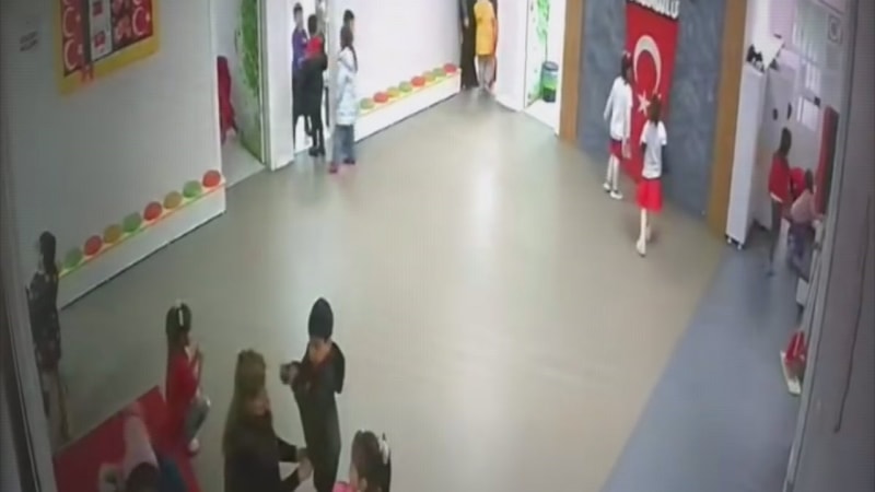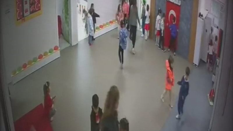 Kayseri'de bir anaokulunda kaydedilen görüntülerde, minik öğrencilerin kırışık bayrağı düzelttiği anlar güvenlik kamerasına yansıdı.