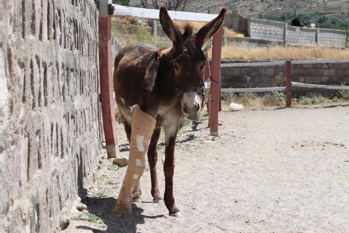 Erciyes Üniversitesi Veterinerlik Fakültesi'ne getirilen eşek, burada tedavi altına alındı. 9 yaşındaki eşeğin ön ayağına alçı tedavisi uygulandı.