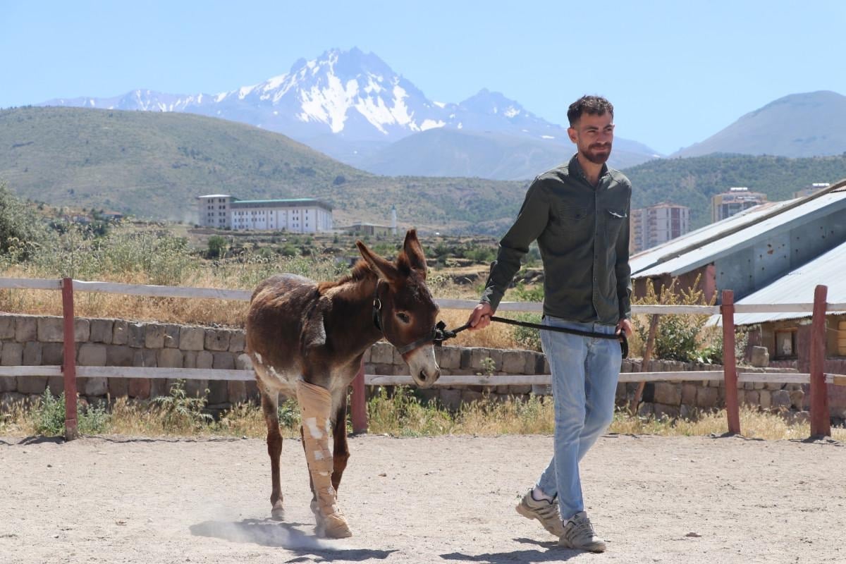 Eşeğin geri kalan yaşamını burada sürdüreceğini belirten Kafkas Atlı Spor Kulübü işletmecisi Kürşat Emir, "Burada atlı faaliyetler gerçekleştirdiğimiz bir spor kulübümüz var. Eşek, Tomarza ilçesinde köylülere yıllarca hizmet ettikten sonra ufak bir rahatsızlık geçirmiş ve sahipleri tarafından terk edilmiş. Vatandaşlarımız, eşeği kötü durumda görünce yetkililere haber vermişler. Eşek, Erciyes Üniversitesi Veterinerlik Fakültesi'nde tedavilerini gördükten sonra kulübümüzde koruma altına alındı. Ön ayağında aksama oluşmuş. Bu yüzden de sahipleri onu terk etmiş. Bir gözünde de görme kaybı var. Şu an bütün tedavilerini gördü. Burada ilaç tedavisine devam ediyor." dedi.