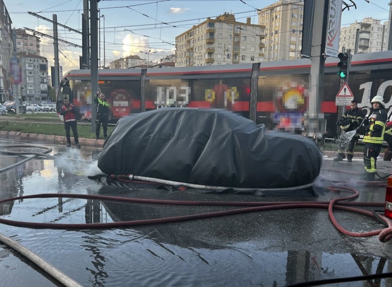 İtfaiye ekipleri, alevler içindeki elektrikli otomobilin üzerine yangın battaniyesi örterek, altından su ile müdahale etti.