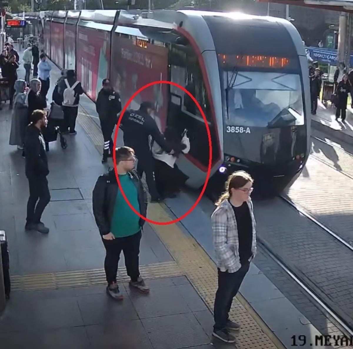 Kayseri Cumhuriyet Meydanı tramvay durağında tramvayı fark etmeyip, yolun karşısına geçmeye çalışan kadın yolcuyu, güvenlik görevlisi kurtardı.
