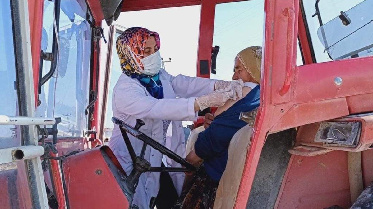 Rahatsızlığından dolayı traktörden inemeyen Ayşe teyzeye ekipte yer alan Sariye ebe traktörün üzerinde aşısını vurdu.