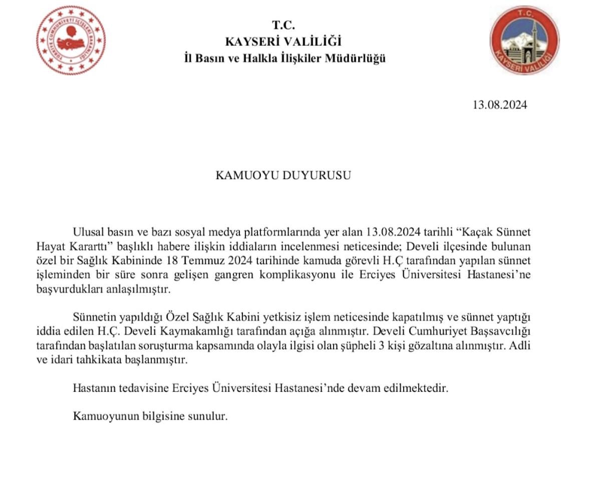Develi ilçesinde bulunan özel bir Sağlık Kabininde 18 Temmuz 2024 tarihinde kamuda görevli H.Ç tarafından yapılan sünnet işleminden bir süre sonra gelişen kangren komplikasyonu ile Erciyes Üniversitesi Hastanesi'ne başvurdukları anlaşılmıştır.