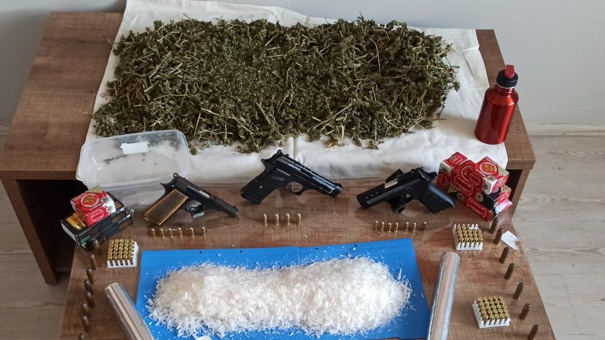 O.A.'nın evinde yapılan aramada ise 1 kilo 36 gram metamfetamin, 1 kilo 250 gram esrar, hassas terazi, 2 tabanca ve uyuşturucu paketleme ekipmanı ele geçirildi.