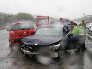 Düzce'de TEM yolunun Gümüşova rampaları mevkisinde, yağış altında Ankara yönünde giden Murat Ağar yönetimindeki otomobil, kayarak bariyerlere çarptı.