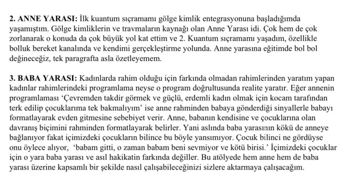 İddialar üzerine hakkında inceleme başlatılan Yeliz Ergün, internet üzerinden 18 bin liraya ‘İçimizdeki Çocuk 2.0’ isimli eğitimi satışa sunuyor ve sosyal medya hesaplarında paylaştığı videolarda ‘Annenizle görüşmeyi keserseniz zengin olursunuz’ gibi ifadelerde bulunuyor.