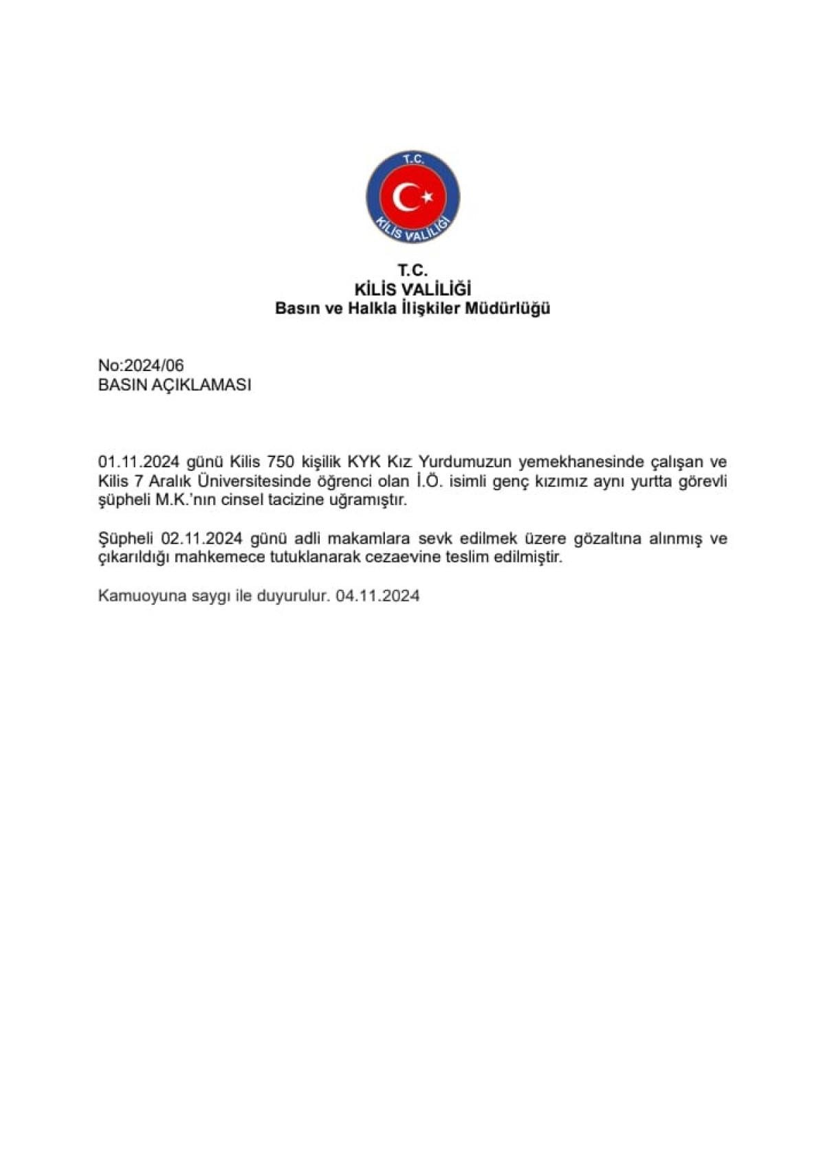 01.11.2024 tarihinde, Kilis 750 kişilik KYK Kız Yurdu'nda yemekhanede çalışan ve Kilis 7 Aralık Üniversitesi öğrencisi olan İ.Ö., yurtta görevli şüpheli M.K.'nin cinsel tacizine uğramıştır. Şüpheli, 02.11.2024 tarihinde adli makamlara sevk edilmek üzere gözaltına alınmış ve mahkeme tarafından tutuklanarak cezaevine gönderilmiştir