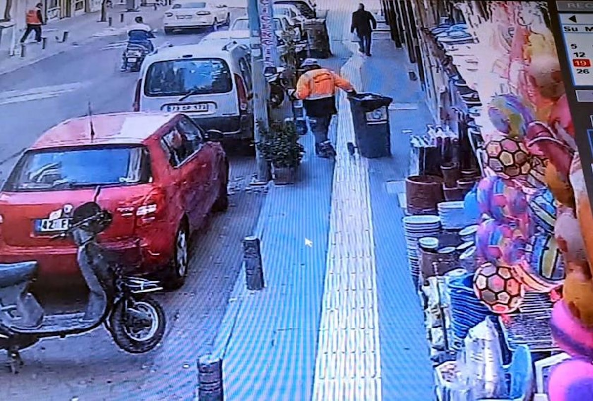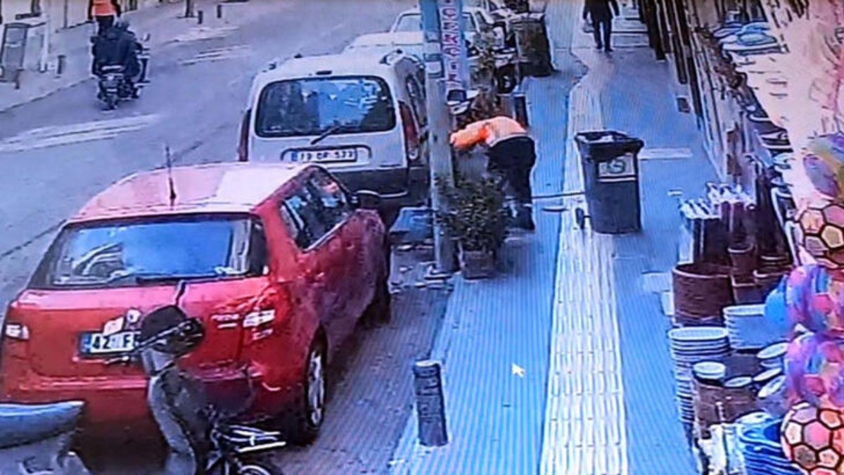 Başına düşen parçanın ardından can havliyle yola doğru hareketlenen temizlik görevlisinin yardımına çevredeki vatandaşlar yetişiyor.