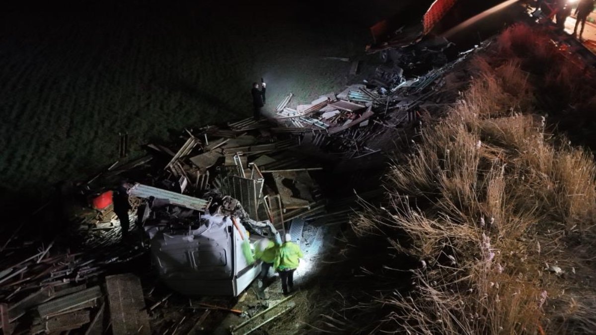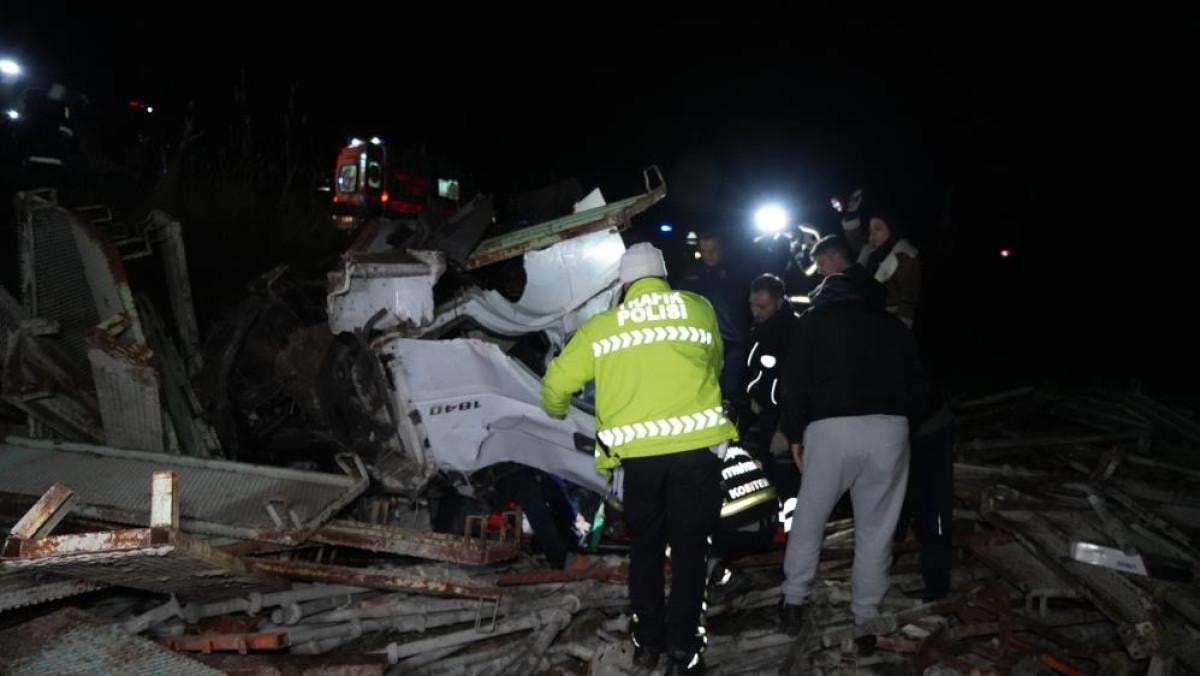 Demir bariyerleri parçalayarak devrilen inşaat malzemesi yüklü tır hurda yığınına döndü.