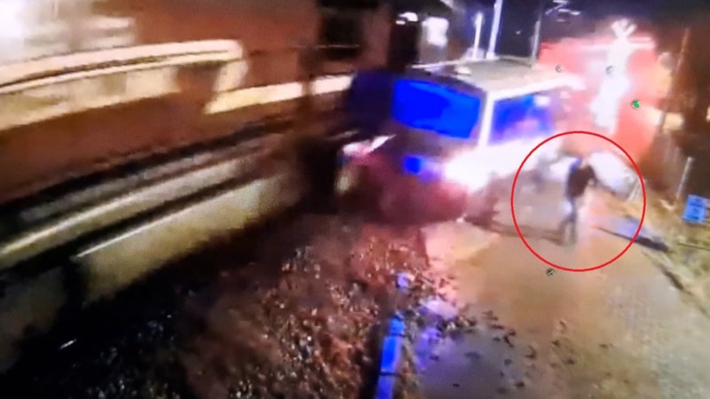 Kırıkkale'de hemzemin geçitte rayda asılı kalan dolmuşa yolcu treninin çarptığı anlar güvenlik kamerasına yansıdı. Dolmuş sürücüsünün tren gelmeden hemen önce araçtan inerek son anda kurtulduğu görüldü.