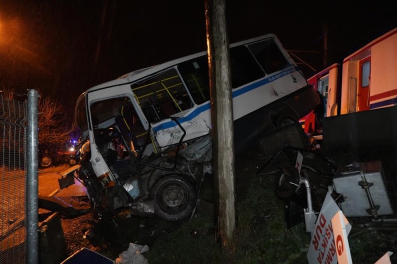 Hızla gelen yolcu treni rayda mahsur kalan dolmuşa çarptı.