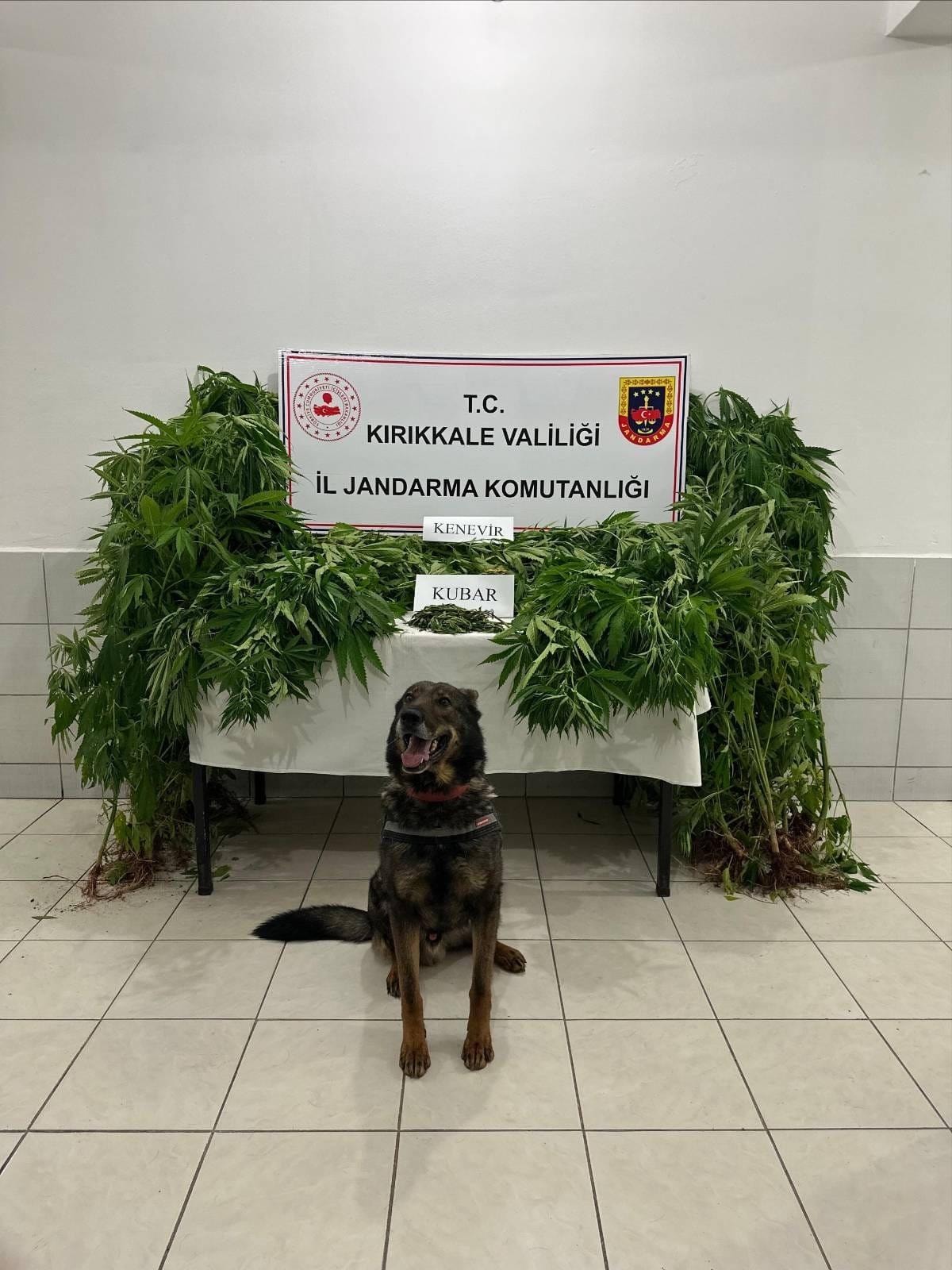 Uyuşturucu madde arama köpeği "Tepe" ile arama yapılan evin balkon kısmında kurumaya bırakılmış 50 gram kubar esrar ve evin arkasındaki bahçesinde ekili 104 kök Hint keneviri bitkisi ele geçirildi.