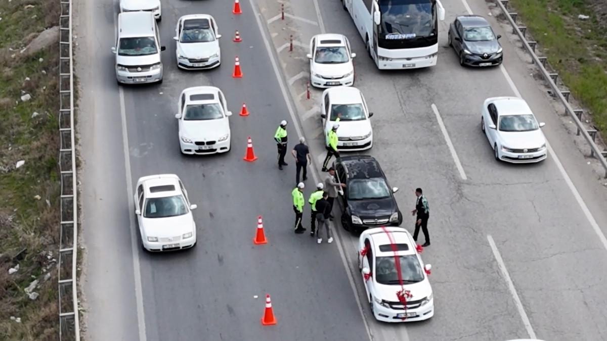 Trafiğin en yoğun olduğu bölgede kural ihlali yapan ve plakası "evleniyoruz" yazısı ile kapatılan gelin arabası durduruldu.