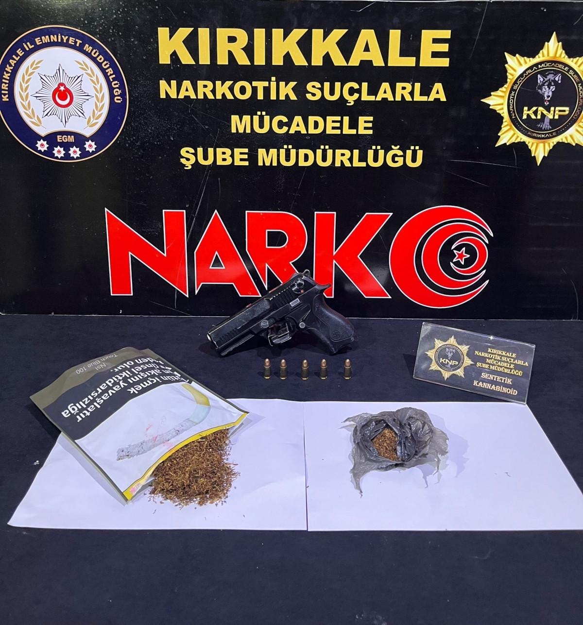 Yapılan aramada 91,48 gram sentetik kannabinoid, 1 adet tabanca ve 5 adet fişek ele geçirildi. Gözaltına alınan şüpheli hakkında adli işlem başlatıldı.