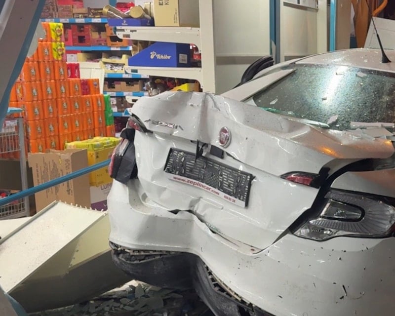 Toplam 5 araç ile markette hasar oluşurken; otomobilin hafif ticari araca çarptıktan sonra kontrolden çıktığı anlar, bir iş yerinin güvenlik kamerasına yansıdı.