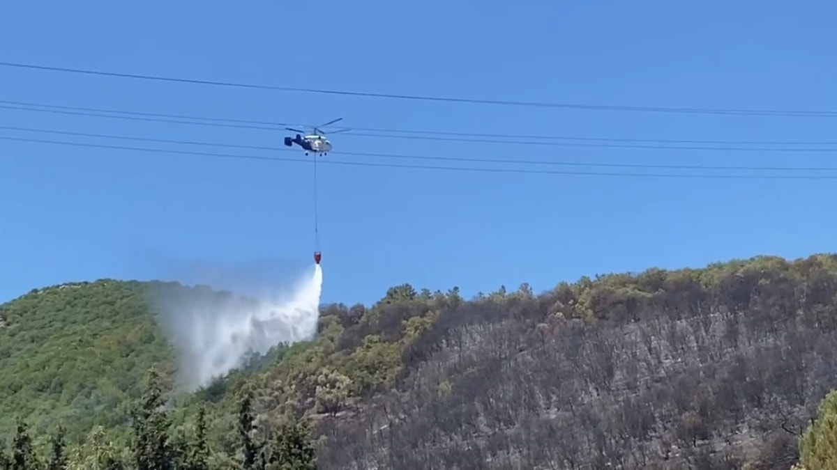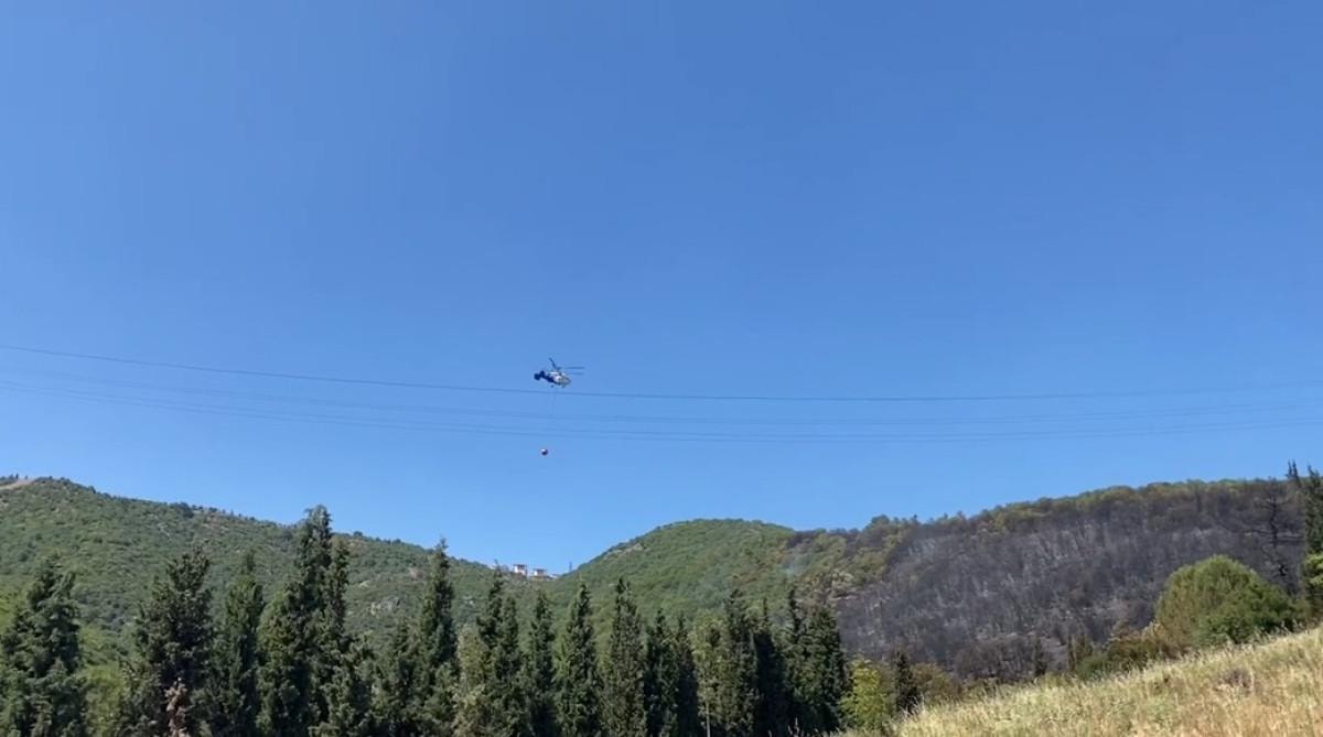 Söndürme çalışmalarına helikopter de destek verdi.